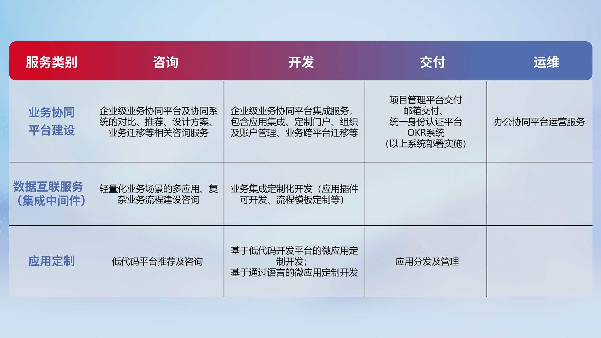 针对钉钉、、、、企微、、、、IDaas等平台级产品提供产品的规划、、、方案、、交付、、定制化开发等服务,,,,实现如统一协同办公、、、智能客户服务、、混合会议管理、、、、智能数据查询、、、、等业务场景,,,,实现数字化转型。。。。