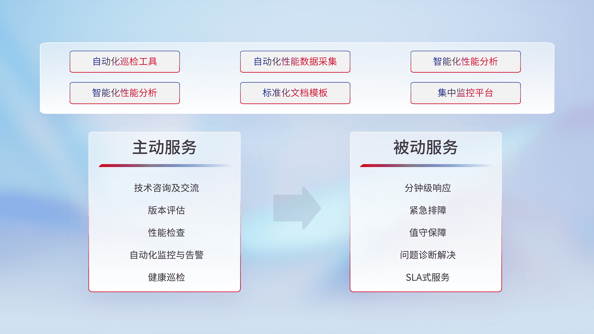 智能化工具和标准化文档,,,保障服务质量,,提供主动服务(包含技术咨询、、版本评估、、、、性能检查、、、、自动化监控与告警、、、健康巡检)和被动服务包含(分钟级响应、、、紧急排障、、值守保障、、问题诊断解决、、、SLA服务)。。